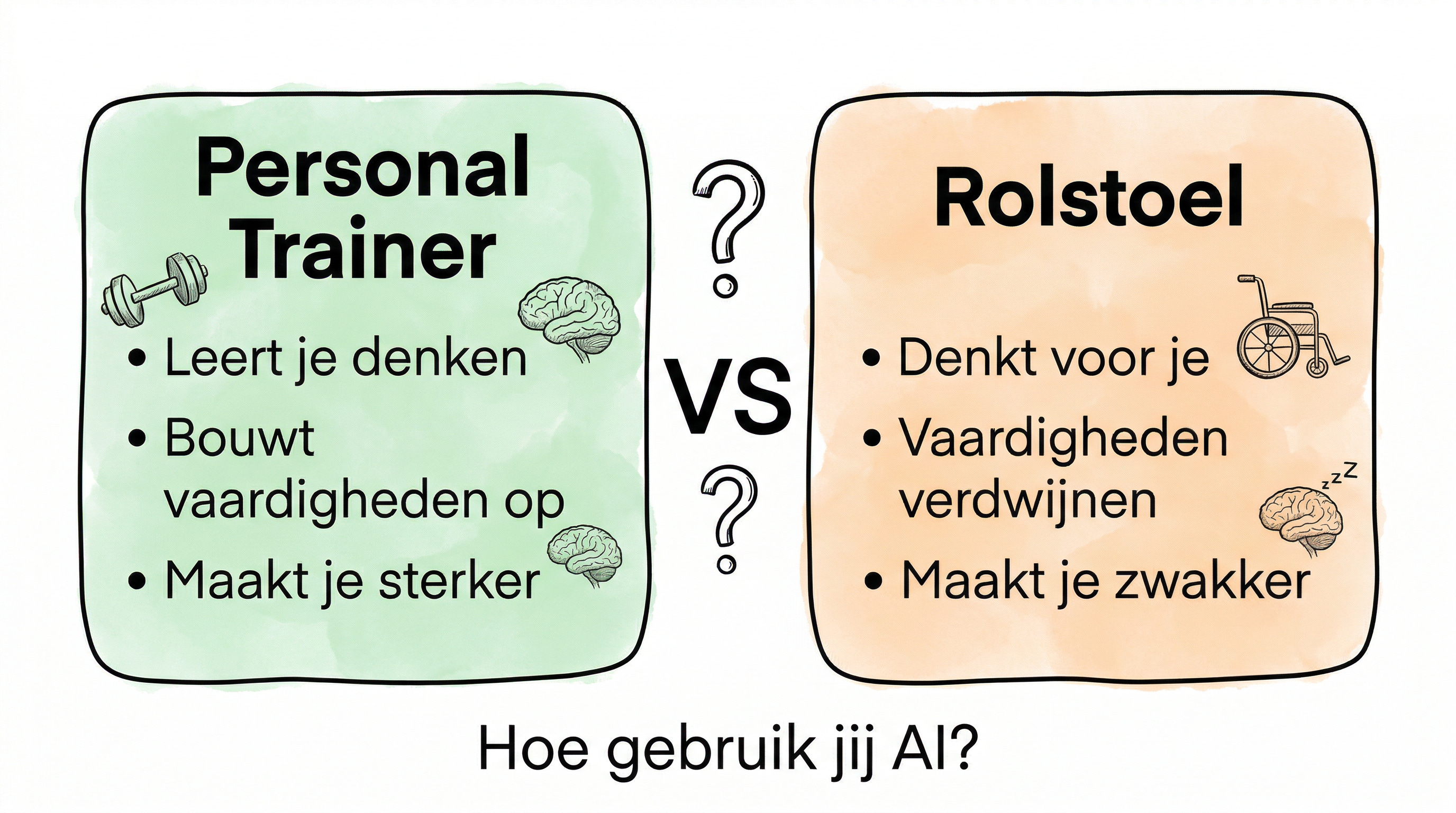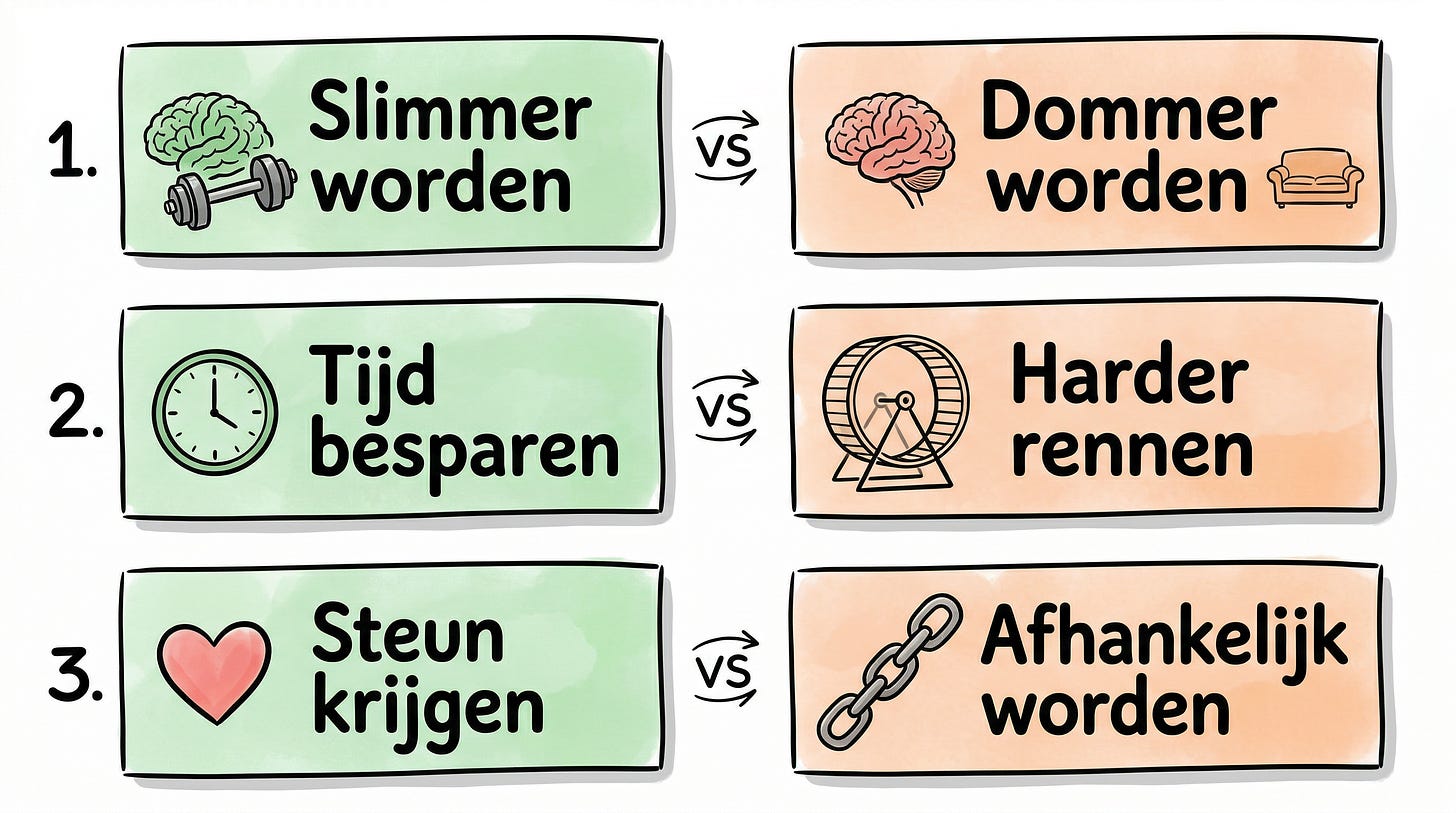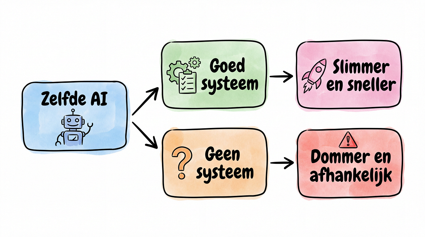 Hier zit iets dat ik in workshops keer op keer terugzie. Mensen die AI gebruiken als personal trainer worden er sterker van. Mensen die AI gebruiken als rolstoel worden er zwakker van. Het verschil? Niet het model. Niet de tool. Het systeem eromheen.