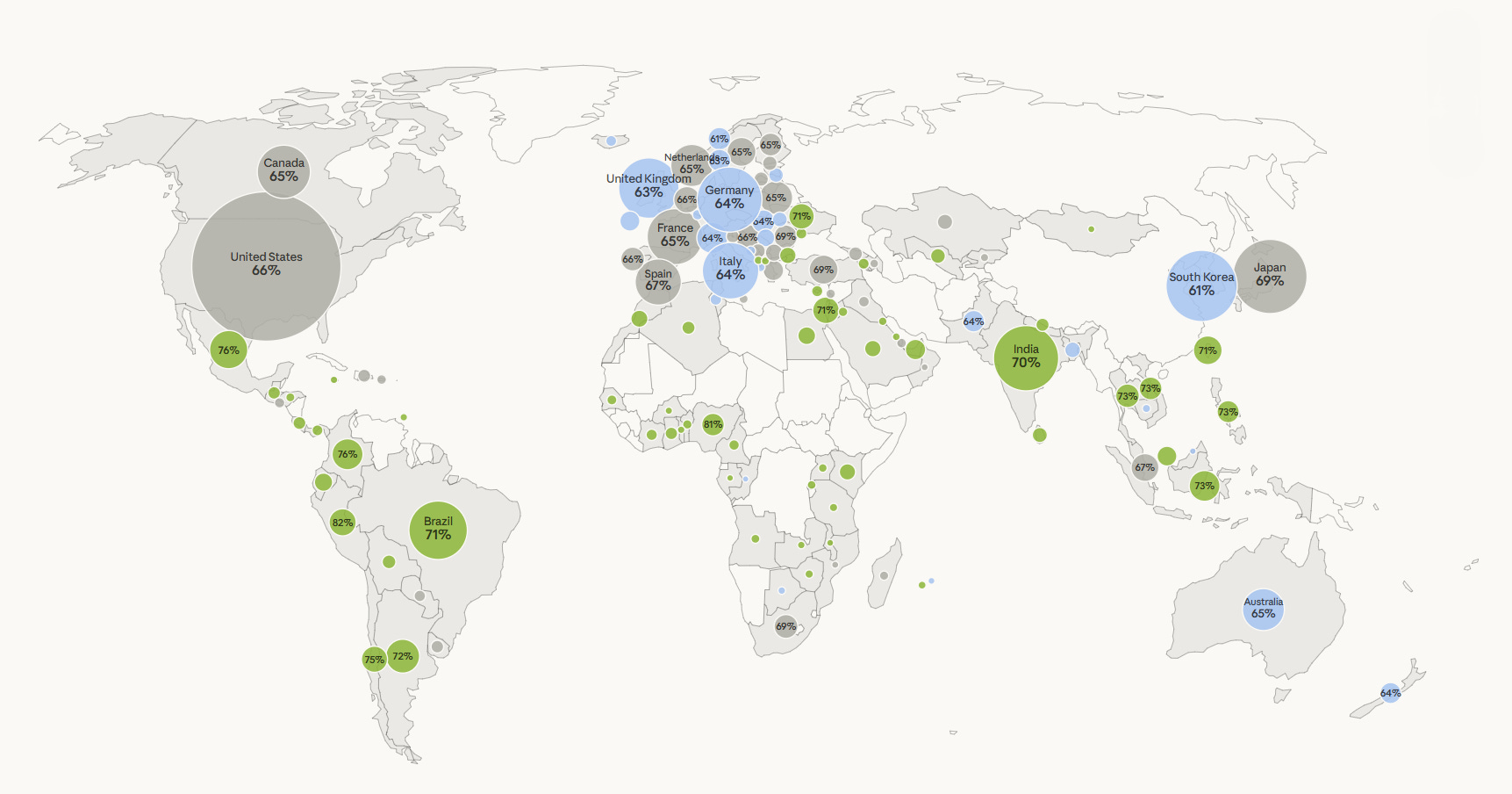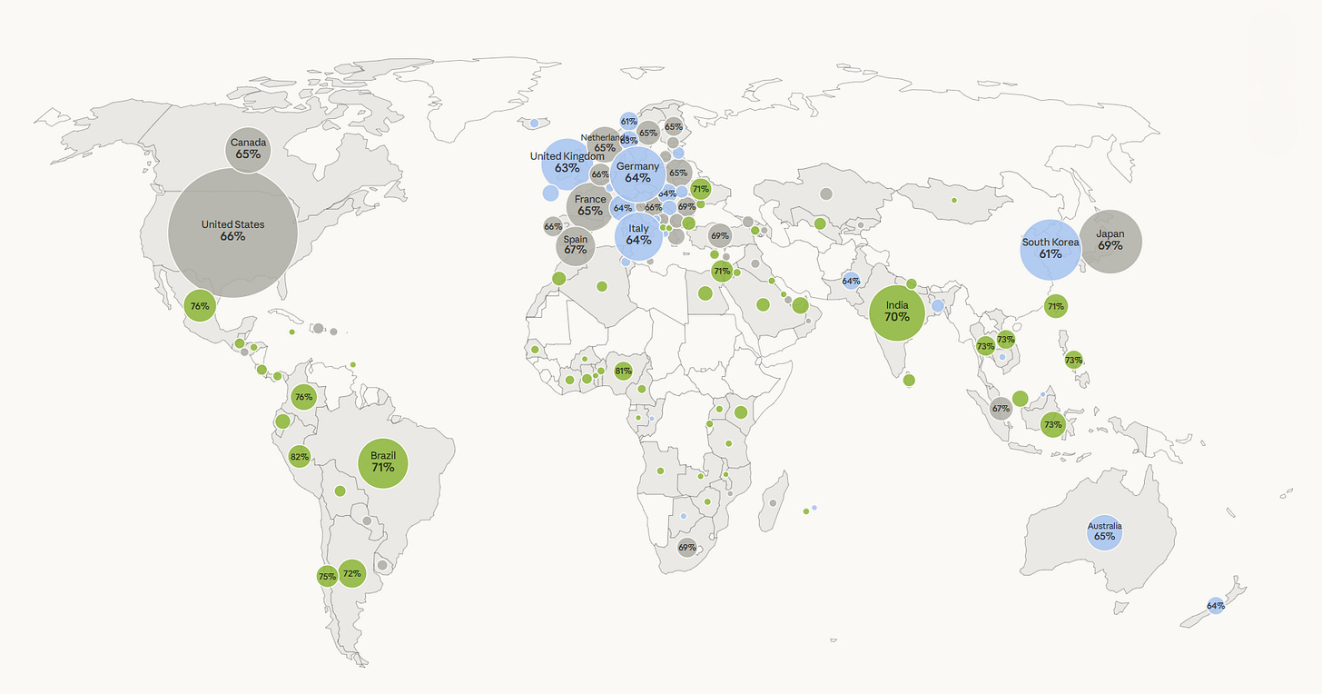 67% van de 81.000 ondervraagden is netto positief over AI. In Afrika ten zuiden van de Sahara is dat 76%. In West-Europa slechts 64%. Wij Europeanen zijn het meest sceptisch. En misschien is dat terecht, want we hebben ook het meest te verliezen als we het verkeerd aanpakken.