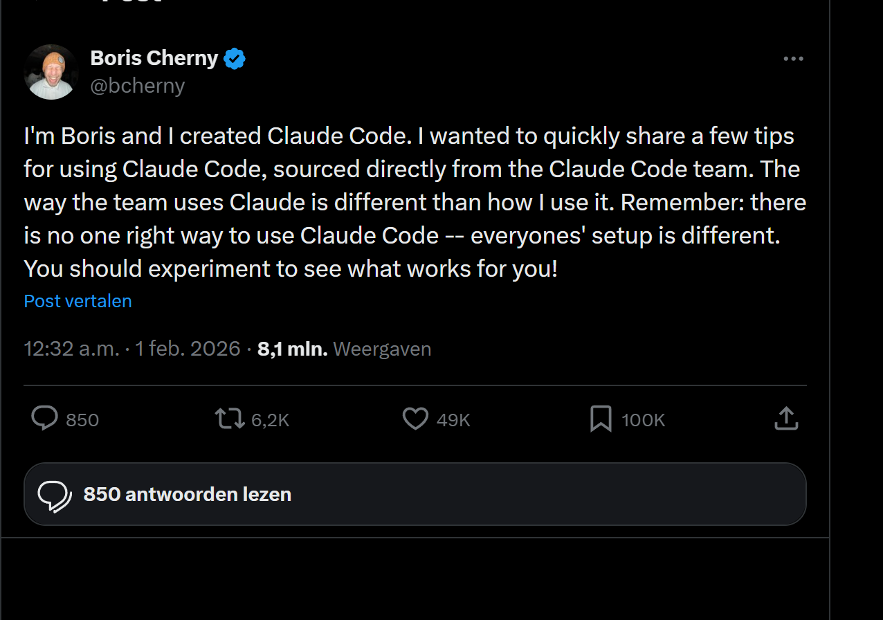 Boris Cherny, de man die Claude Code heeft gebouwd, schreef vorige week een X-thread met 10 tips van zijn eigen team. 49.000 likes. Maar het interessantste was niet de tips zelf. Het was de onthulling dat Cherny al twee maanden geen enkele regel code meer met de hand schrijft. Nul. Alles via Claude Code. En de principes die hij deelt? Die zijn net zo relevant als je geen developer bent.