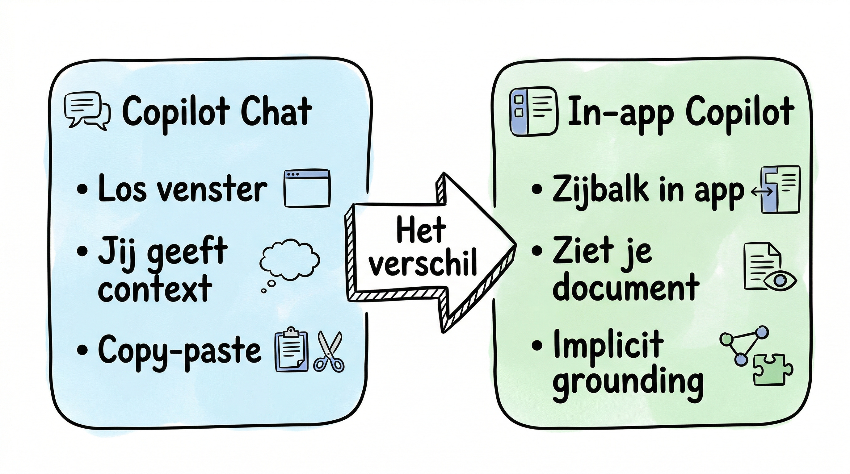 Het technische verschil is simpel maar cruciaal. Copilot Chat (het standalone chatvenster) werkt op basis van wat jij erin stopt. Je typt een vraag, je voegt een document toe via het plusje, je geeft context. Je bent de chauffeur.