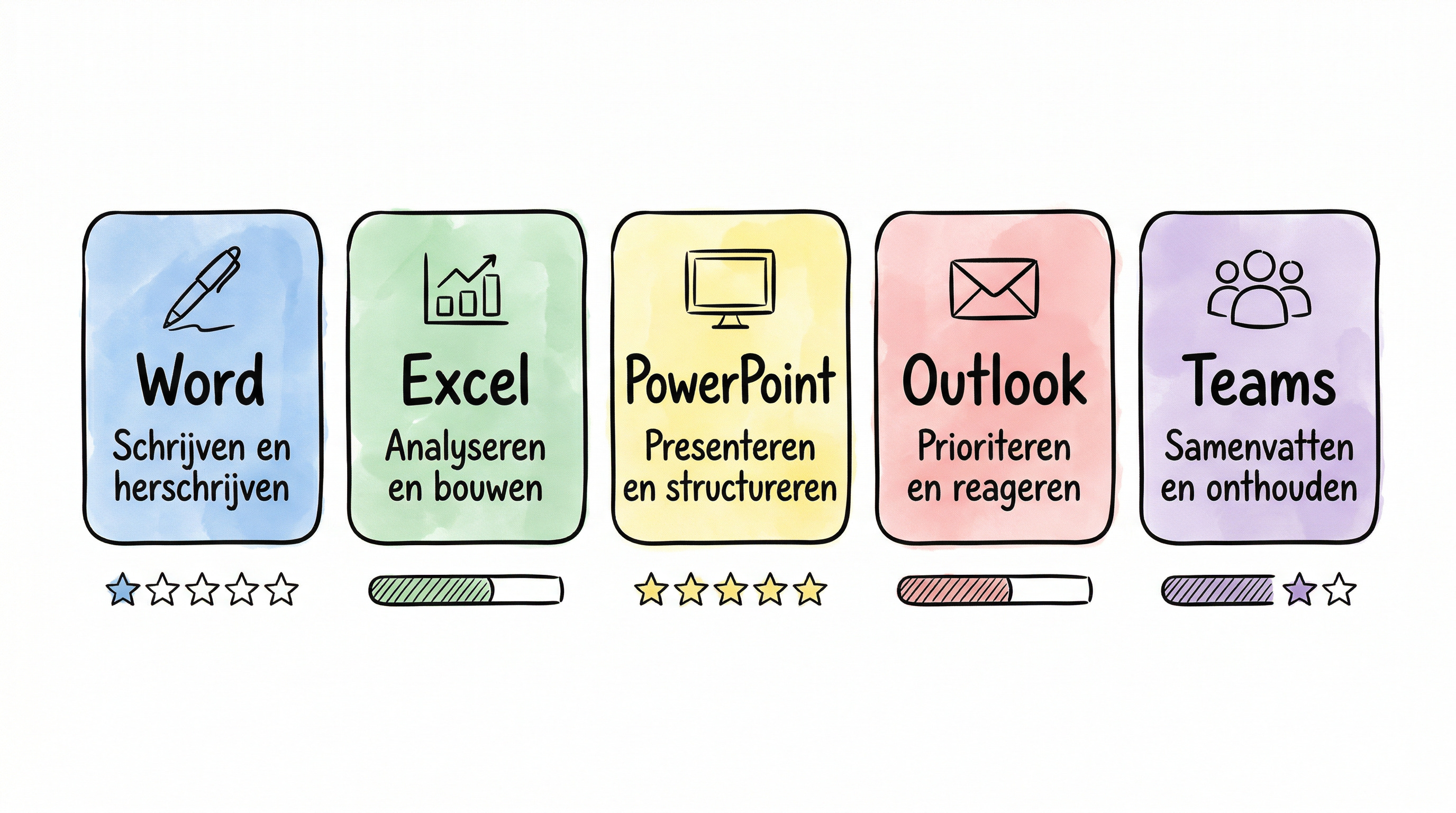 Goed, dat was de basis. Wat hieronder staat is wat ik normaal deel in mijn trainingen bij organisaties: drie complete workflows met stap-voor-stap instructies (van leeg Word-document naar presentatie, van ruwe data naar Excel-dashboard, van volle inbox naar gestructureerde ochtend), een Copilot Cowork walkthrough, vijf kopieerbare prompt templates per app, de zeven fouten die ik bij elke training zie, en eerlijke grenzen per app.
