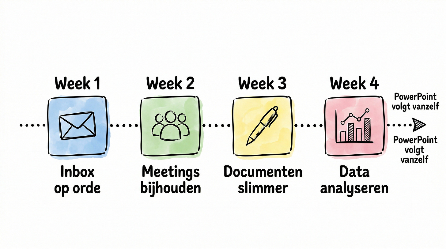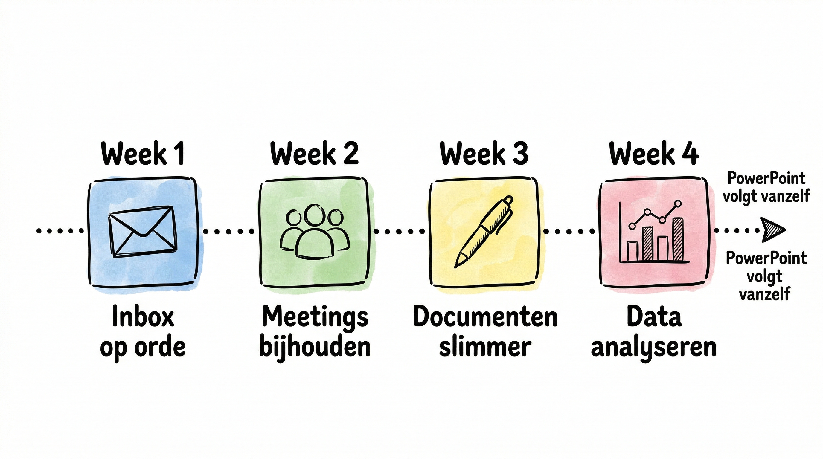Week 1: Outlook. Begin waar je elke dag begint. Samenvatten van threads, concept-emails, prioriteren. De drempel is laag en de tijdwinst is direct merkbaar. Stel meteen je Draft Instructions in.
