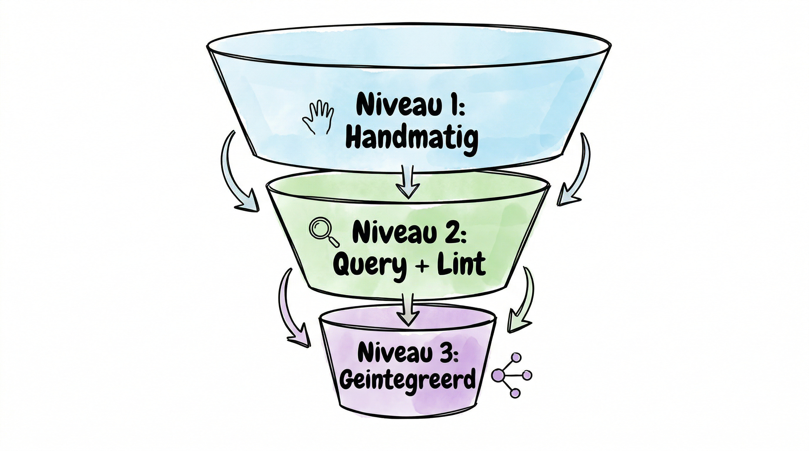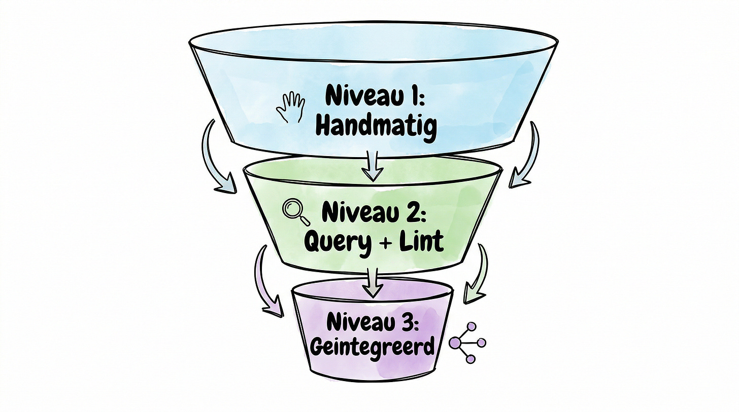 Je stelt actief vragen aan je wiki en laat goede antwoorden opslaan als nieuwe pagina’s. Je draait periodiek een lint-check: de LLM controleert de wiki op tegenstrijdigheden, verouderde informatie, en ontbrekende verbanden. Je wiki wordt niet alleen groter, maar ook gezonder.