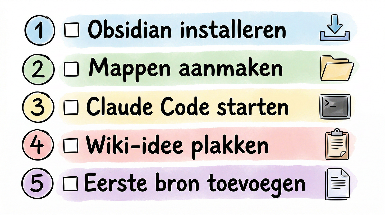 4. Het kost je bijna niks. Geen subscription, geen database, geen server. Obsidian is gratis. Claude Code kost je tokens, maar minder dan je denkt, want de wiki is compact. Vergelijk dat met een Notion-abonnement, een NotebookLM-limiet, of een enterprise RAG-pipeline. Dit is een map met tekstbestanden op je eigen computer. Niks meer, niks minder.