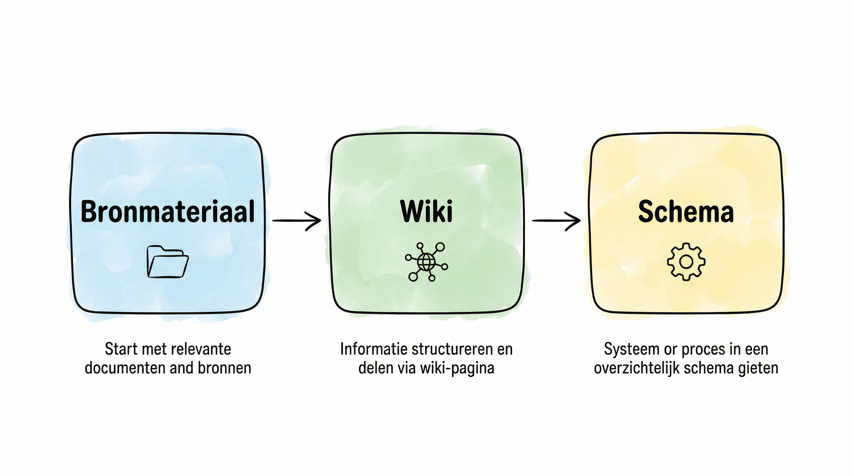 Vergelijk het met een kantoor. Het bronmateriaal is de stapel post die elke dag binnenkomt. De wiki is het archief dat je secretaresse bijhoudt: netjes gelabeld, kruisverwijzingen, alles vindbaar. Het schema is de instructie die je die secretaresse hebt gegeven: “Sorteer op onderwerp, maak bij elke nieuwe klant een apart dossier, en leg bij elke factuur een notitie over de betaalstatus.”