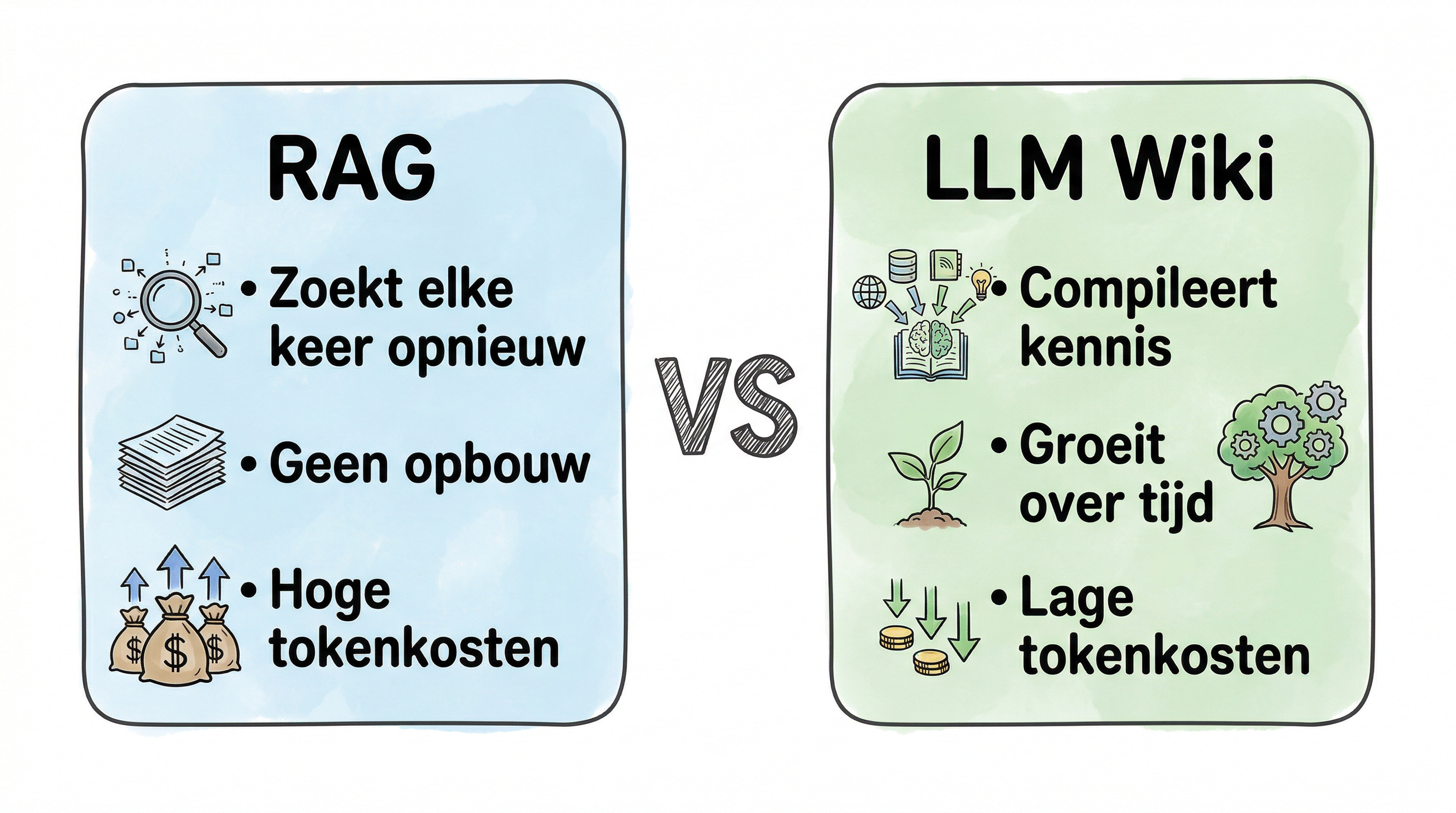 Vergelijk het met studeren voor een tentamen. Je kunt elke keer je boek openslaan en de relevante passages zoeken. Dat is RAG. Of je kunt samenvattingen maken, mindmaps tekenen, en aantekeningen schrijven in je eigen woorden. Dat is de wiki-aanpak. Na een maand studeren heb je bij de eerste methode nog steeds alleen een boek. Bij de tweede heb je een persoonlijk naslagwerk dat precies aansluit bij jouw begrip.