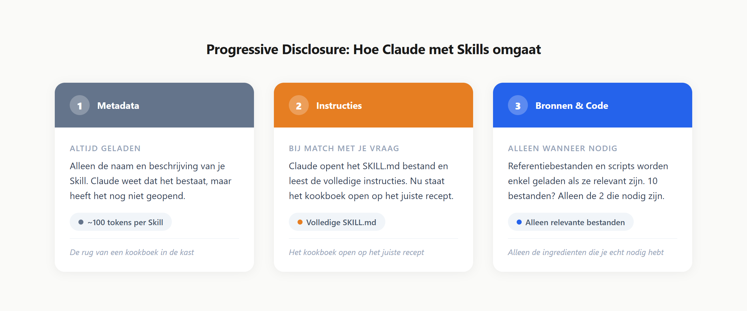 Niveau 1: Metadata. Claude leest bij het opstarten alleen de naam en beschrijving van je Skill. Vergelijk het met het lezen van de rug van een kookboek in de kast. Claude weet dat het bestaat, maar heeft het nog niet opengeslagen. Dit kost bijna geen geheugenruimte: circa 100 tokens per Skill. Om dat in perspectief te plaatsen: een MCP-server (de andere manier om Claude uit te breiden) kost al snel 20.000 tokens. Dus je kunt letterlijk 200 Skills installeren voor dezelfde kosten als een server-integratie.