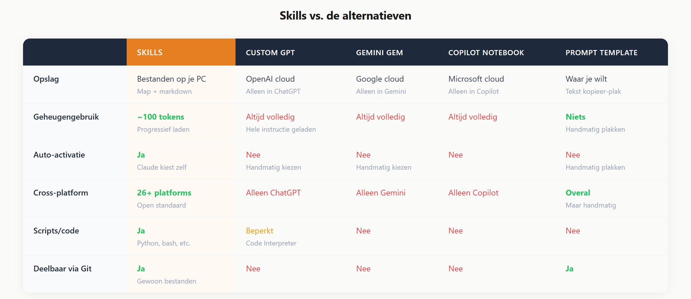 Is dit beter? Hangt af van je situatie. Als je een klantenservice-chatbot bouwt die altijd dezelfde persona moet hebben, is een Custom GPT of Gem prima. Maar als je een professional bent die tien verschillende taken herhaalt, met wisselende context, en je wilt niet vastzitten aan een platform: dan zijn Skills de betere keuze.
