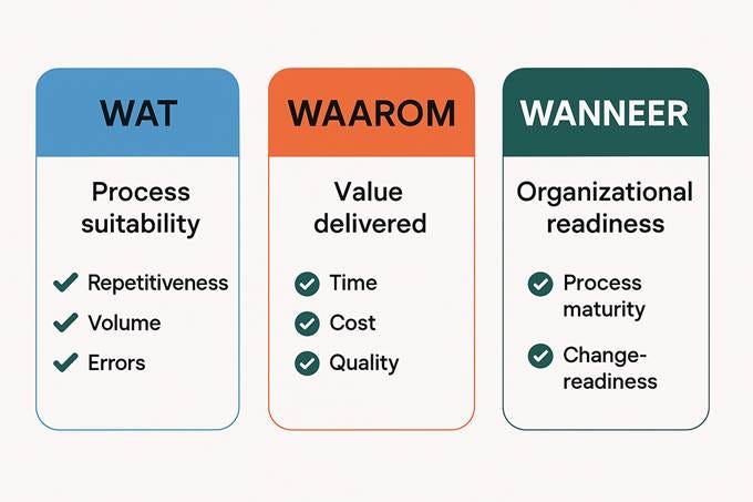 Het Wat-Waarom-Wanneer Framework: Niet elk proces is geschikt voor automatisering. Dit framework helpt de meest waardevolle kansen te identificeren.